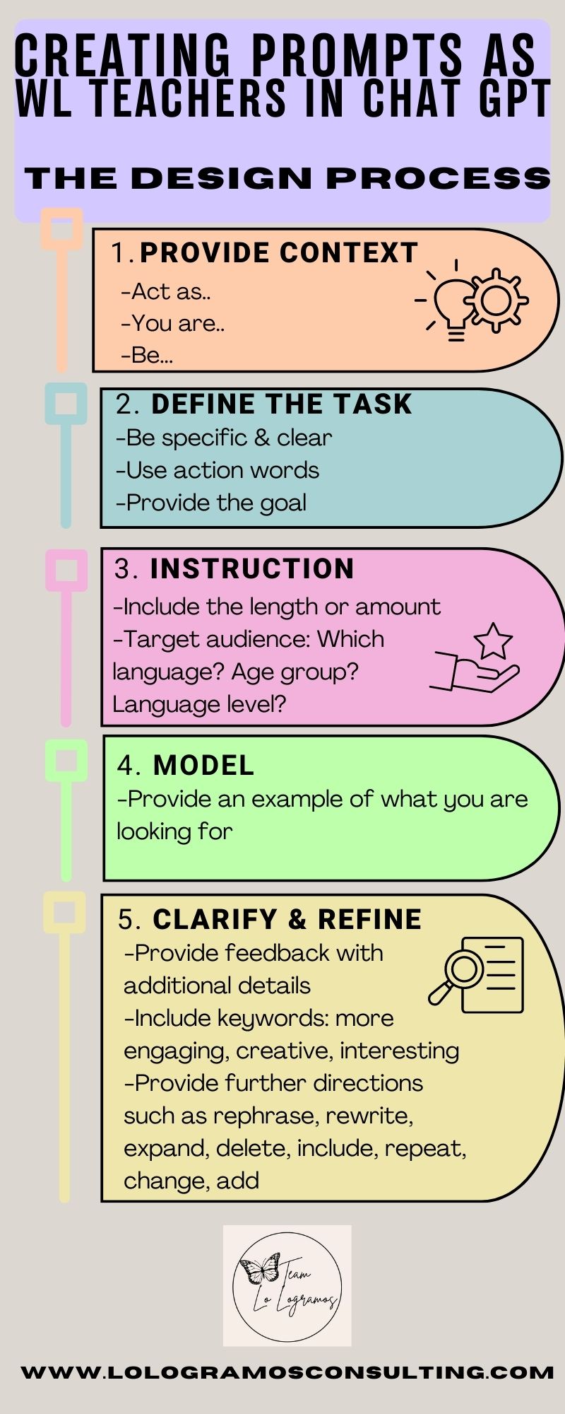 I’ve designed the below guide to assist language teachers create a well designed prompt, with the intentionality of having the “export” align with your expectations. I’ve also created a collaborative prompt library for language educators, which is one of the many perks in joining the AI Learning Academy for Language Educators community. When designing your prompt, consider all of the different important elements that you would like to include. A simple rule of thumb is understanding the better the prompt provided, the better the output. Chat GPT or other LLMs of preference can truly serve as your thought partner, brainstorming buddy, content creator or my favorite role- your new personal assistant. Consider the possibilities!