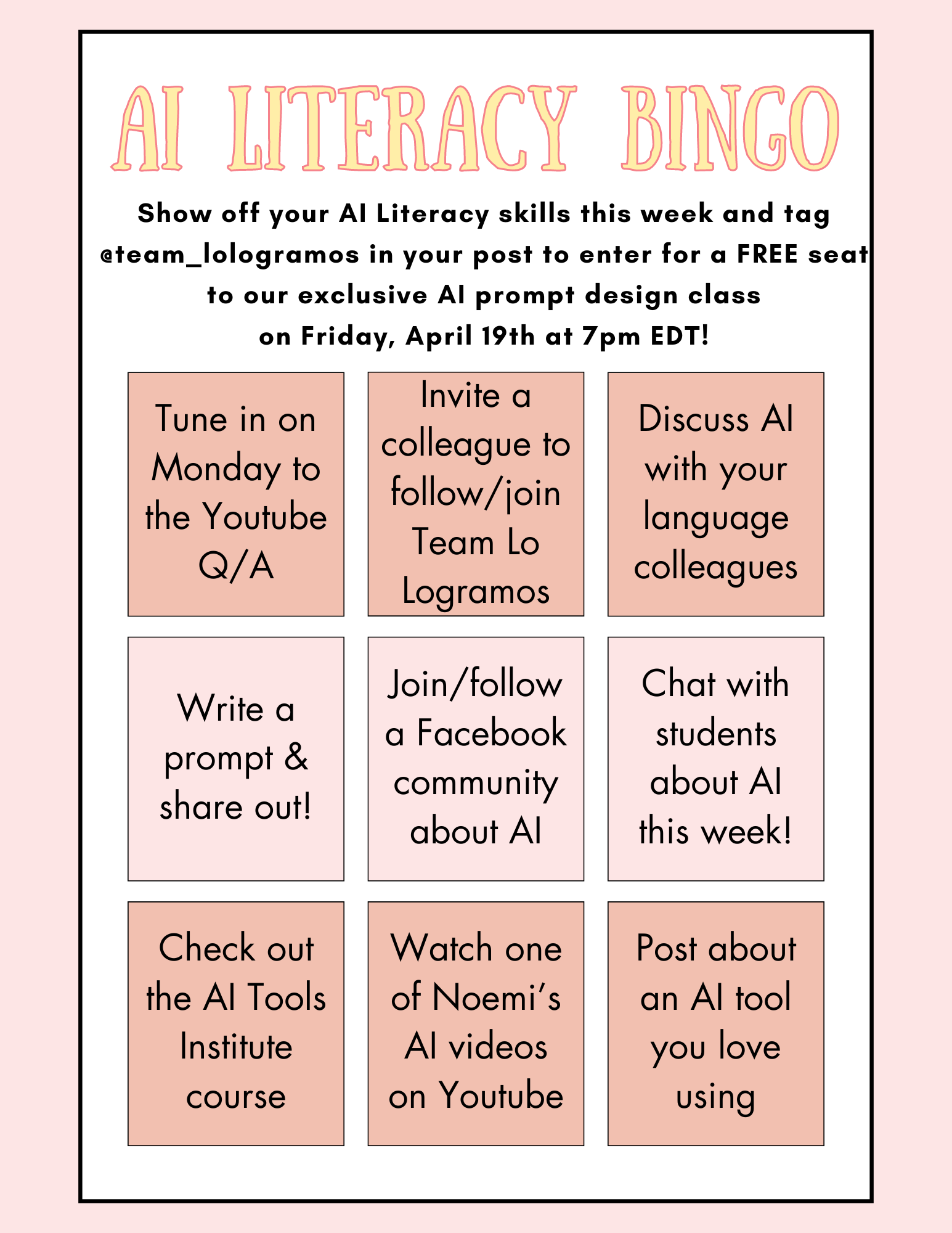 Your Bingo-related post will also enter you into a raffle to win a free seat to the AI Prompt Design class taking place on Friday, April 19th at 7pm EDT, exclusively designed for all language educators.