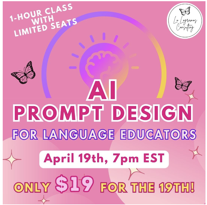 🦋 On Friday, April 19th – 7pm EDT – the AI Prompt Design Class for Language Educators – We’ll delve into the fascinating world of AI prompt design. You’ll gain valuable insights, practical strategies and step by step instructions to enhance your Generative AI prompt creation, teaching toolkit and effectively integrate AI into your language instruction. And it’s only $19 for the 19th! (*recording will be shared)