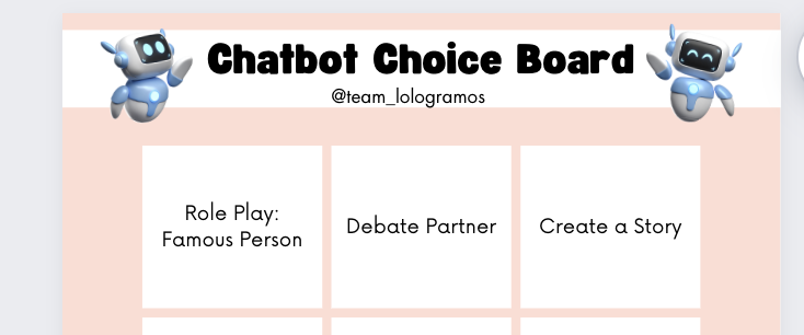 To receive your own copy of the handy Chatbot Choice Board, please head over to the private Team Lo Logramos Facebook Community. There you will be able to request to join our community and later, access the Chatbot Choice Board for use in your language department or with your language students!