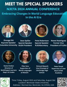 The 2024 NJCTA International Conference with the theme of Embracing Changes in World Language Education in the AI Era (AI 时代语言教学国际研讨会) will be held on Aug 30th and Aug 31st 2024. It will be held in person and Zoom at Montclair State University in Montclair, New Jersey.