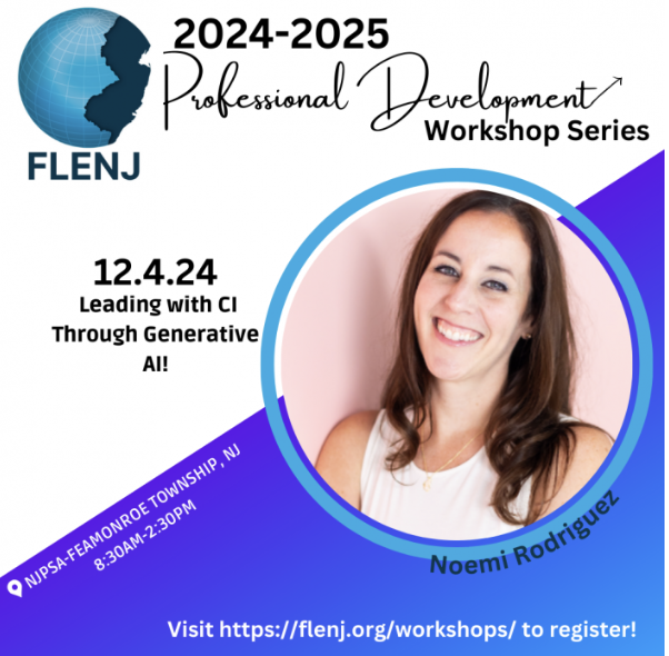 In-Person FLENJ Workshop on Wednesday, 12.4 in  Monroe Township, NJ! We will spend a day together all about how we can lead with using comprehensible input with the assistance of Generative AI!  Let’s S.O.A.R with CI & AI! In this workshop, explore the powerful fusion of acquisition-driven instruction (CI) and Generative AI tools for world language teaching. Discover […]